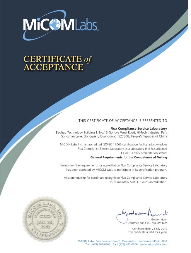 美国MiCOM授权证书 Cert of Accept July 2019 - Flux Compliance Service Laboratory