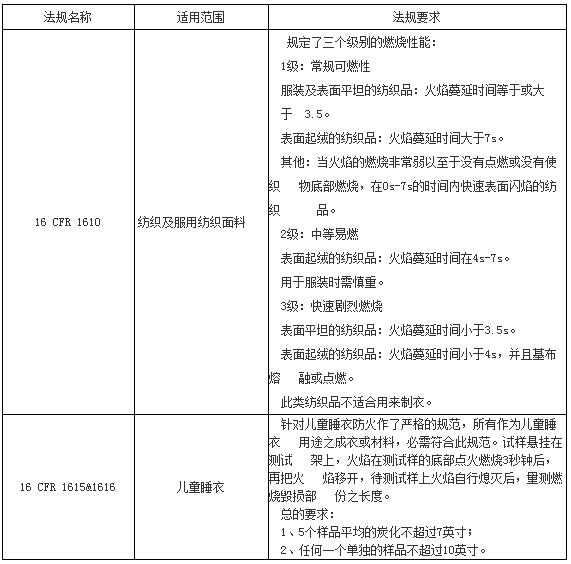 此页重点介绍了美国针对纺织服装的燃烧法规:纺织服装燃烧16 CFR 1610,儿童睡衣燃烧法规16 CFR 1615&1616;法规详情可参见如下:
