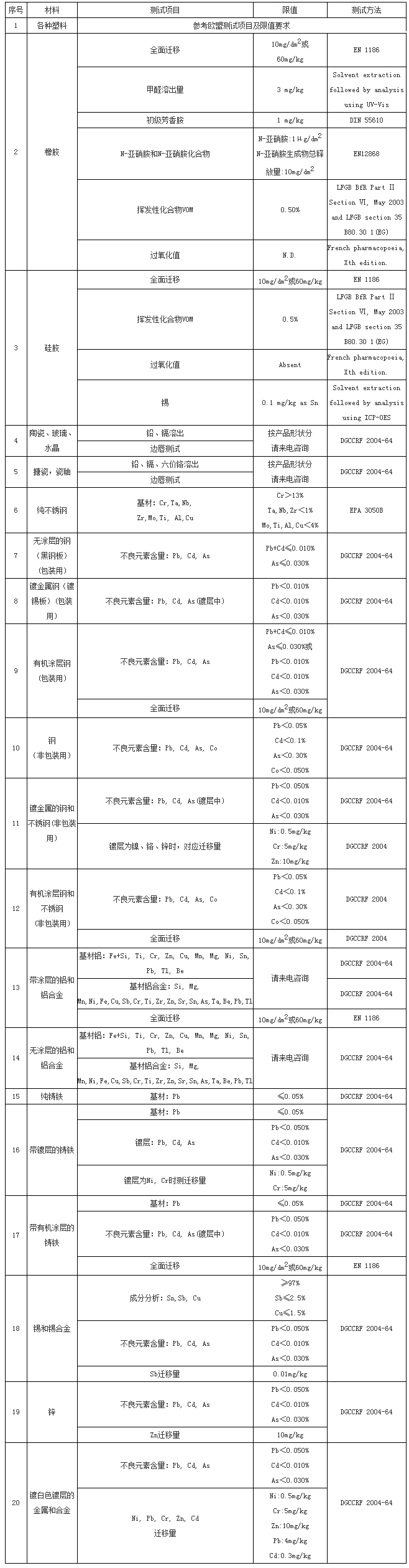 法国作为欧盟的成员国之一,在符合欧盟食品级法规要求的基础上,制定本国的食品级法规The decree of No 2007-766. 为公众更好的理解和实施法国所颁布的食品接触材料法规要求,法国竞争、消费和反欺诈总局DGCCRF 制定了一个指南性的文件DGCCRF 2004-64通告来配合相关强制力法规的执行,虽然该指南文件并不具备法律效力,但是通告中的解释和建议的检测标准方法等信息在实际运作中被广泛认可和采纳。