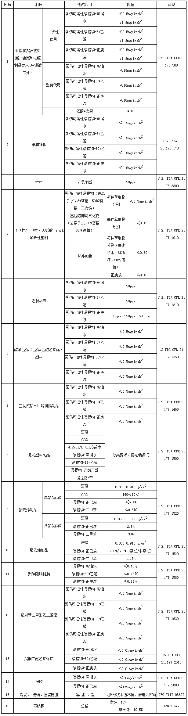 美国具体对与食品接触容器及材料的通用要求: